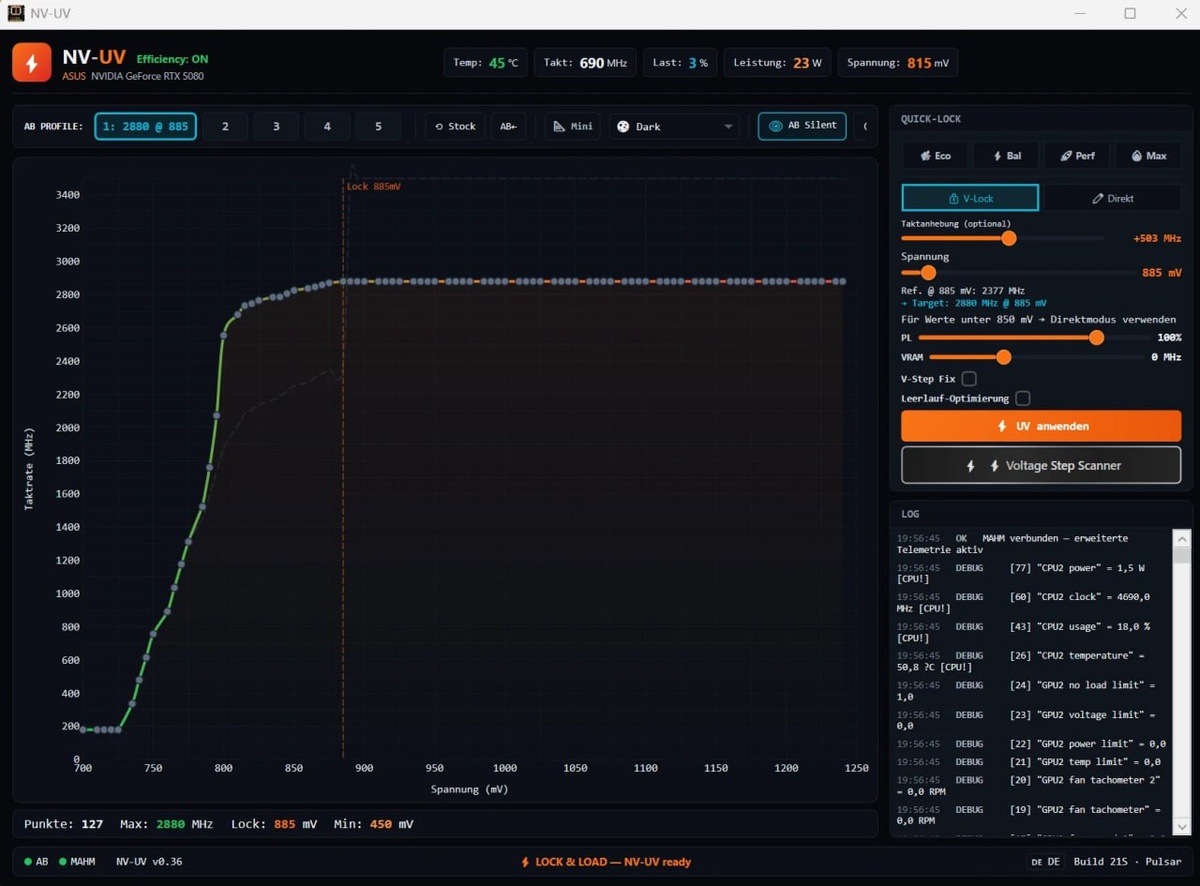 Инструмент разработал энтузиаст cubi2k82, а работает он как дополнение к MSI Afterburner. Проблема в том, что новые GPU больше не позволяют напрямую редактировать кривую напряжение-частота через NVAPI, поэтому ручная настройка стала сложнее. NV-UV добавляет поверх Afterburner автоматизацию и готовые профили — Eco, Balanced, Performance и Max. Одной из ключевых функций стал режим UV-Pilot. Он умеет распознавать запущенные игры и автоматически применять подходящий профиль понижения напряжения. В базе уже более 570 игр. Утилита также включает Auto-UV сканер, который с помощью стресс-теста DX12 и DXR подбирает максимально стабильную частоту при заданном напряжении.
