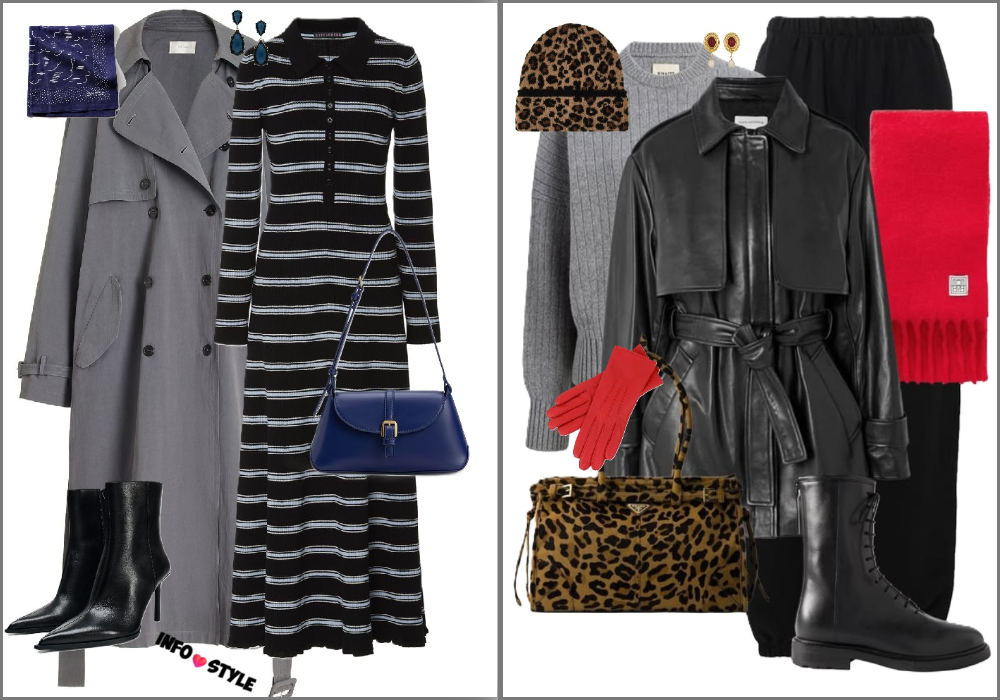 Особый характер этому образу с чёрными брюками, серым свитером и кожаной курткой придают детали: насыщенный красный шарф с бахромой и кожаные перчатки в тон создают выразительный контраст, а леопардовый принт на шапке и объемной сумке добавляет ноту бунтарства.
