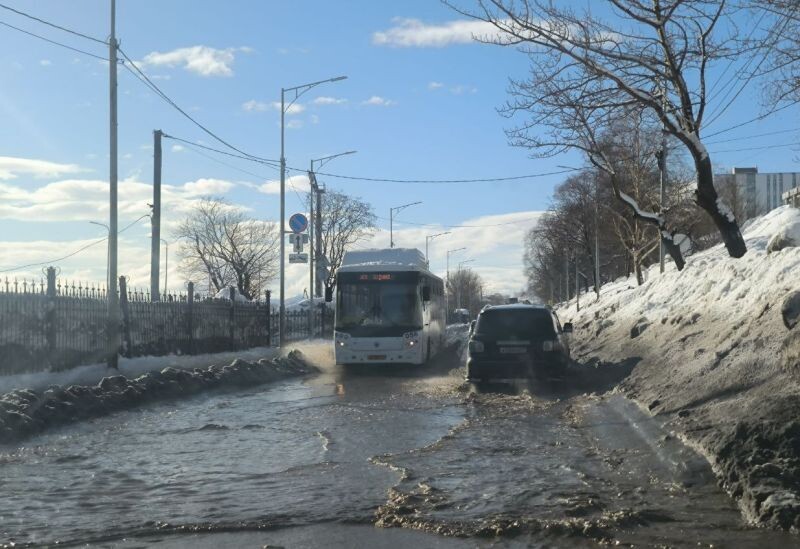 Очередной циклон, принёсший мокрый снег и потепление, привёл к тому, что на многих дорогах Петропавловска-Камчатского образовались огромные лужи, передаёт РАИ «КАМЧАТКА-ИНФОРМ». Ливневая канализация не справляется с потоками воды. По информации читателей и видео в соцсетях, традиционные «озёра» образовались сегодня, 9 марта, у стадиона «Спартак» на улице Ленинградской, на Озерновской косе и в других местах. Район Богородского озера начал напрямую оправдывать своё название. На обочинах в снегу торчат автомобильные номера, оставленные в больших лужах. Напомним, потопы в городе при аналогичных погодных условиях этой зимой случались в краевой столице уже неоднократно. Фото РАИ «КАМЧАТКА-ИНФОРМ» (архив). 🟠 КАМЧАТКА-ИНФОРМ — новости Камчатки в Telegram 🟠 Фоторепортажи и эксклюзивные материалы на kamchatinfo.com 🟠 НАПИСАТЬ НАМ