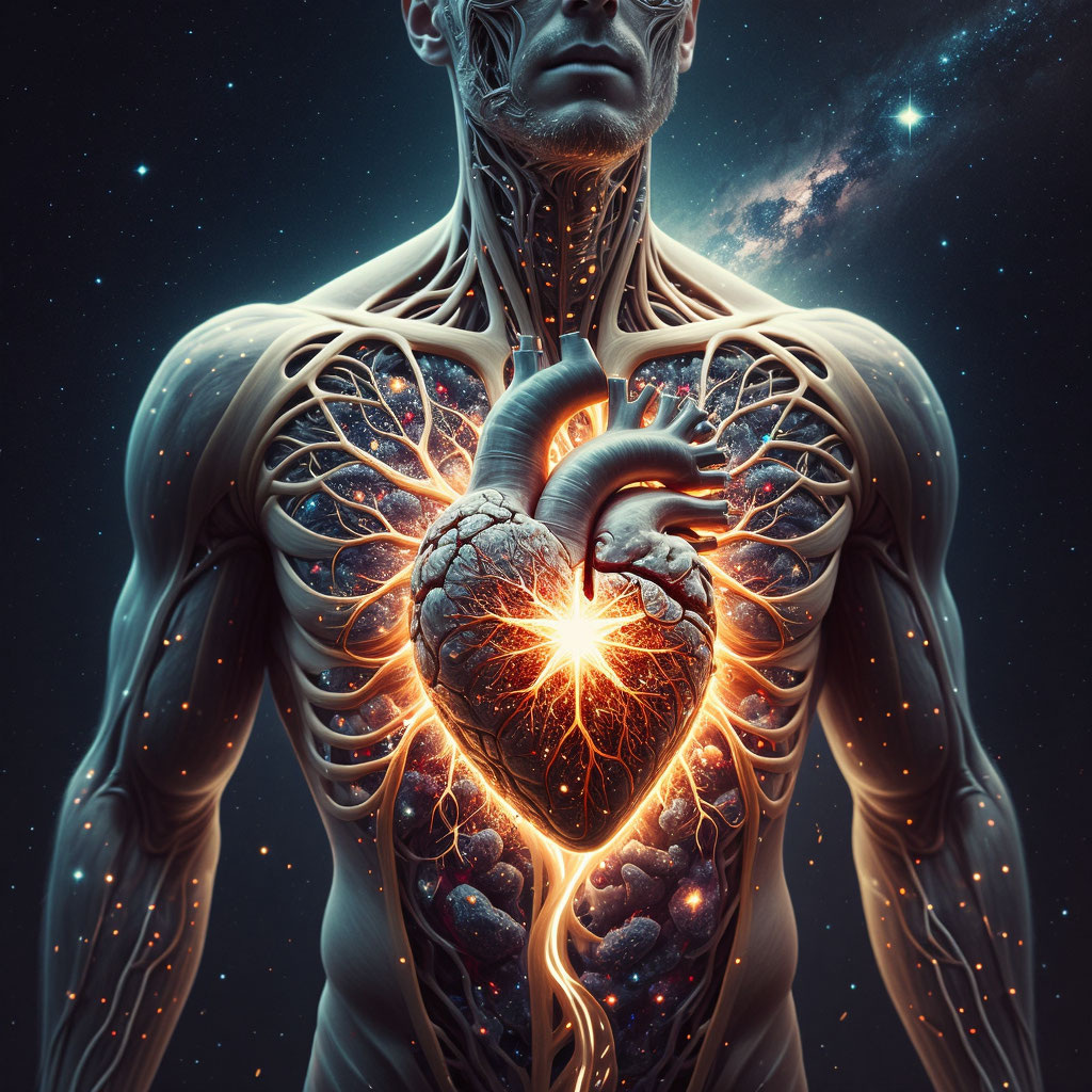 В его глубинах бегут электрические искры — словно вспышки сверхновых. Его клапаны открываются и закрываются, как врата между мирами. А коронарные артерии оплетают его, словно светящиеся нити, питающие саму звезду.