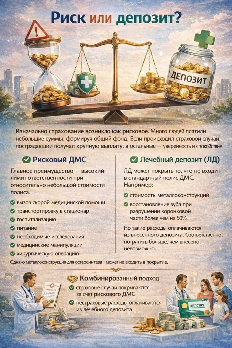 В ДМС рИсковое страхование проявляется в том, что лимит ответственности страховщика в сотни раз превышает размер страховой премии. За несколько десятков тысяч рублей застрахованный защищëн на несколько миллионов