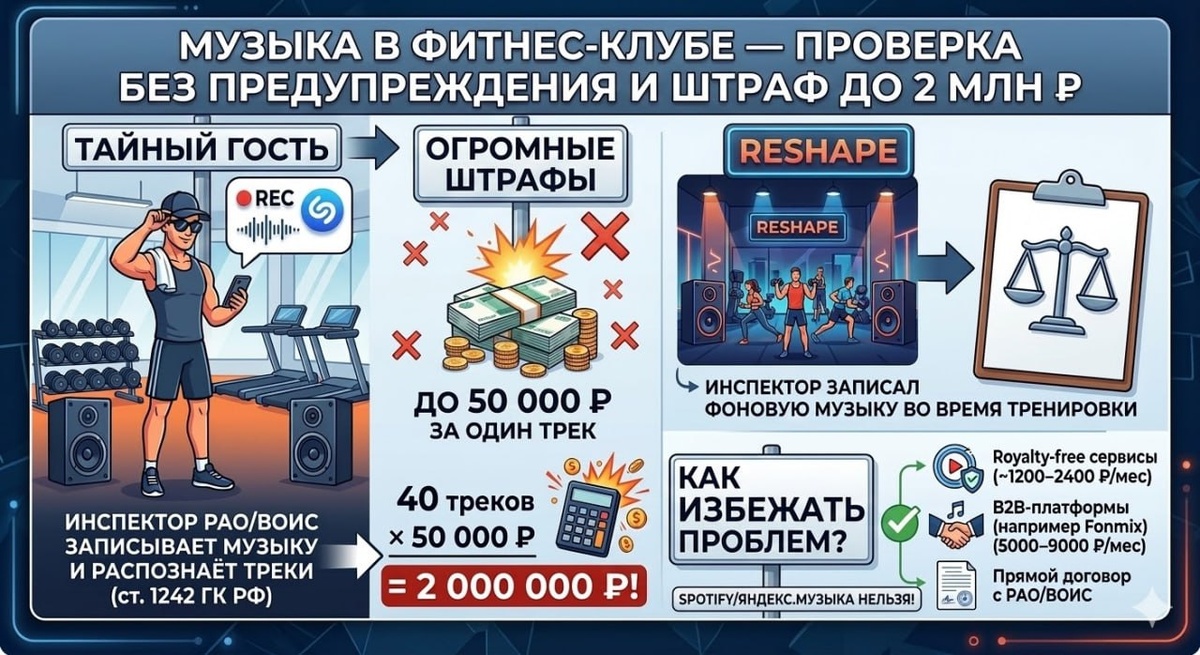 В России действует мораторий на проверки бизнеса. Но есть организации, которым выдали специальные права на внезапные проверки. Представители Российского авторского общества (РАО) и Всероссийской организации интеллектуальной собственности (ВОИС) могут зайти в клуб как обычные клиенты и провести тайную проверку. Схема простая: инспектор покупает разовое посещение, записывает музыку в зале на телефон и распознаёт треки через Shazam. Закон (ст. 1242 ГК РФ) разрешает аккредитованным организациям самостоятельно собирать доказательства нарушения авторских прав. Их прихода достаточно, чтобы вчинить огромный иск. Почему такие большие суммы? Подвох в том, что суд считает каждую композицию отдельным нарушением. Компенсация может достигать 50 000 ₽ за трек. Если в плейлисте 40–50 песен — счёт легко переваливает за миллион. Так произошло с московским фитнес-клубом Reshape. Инспектор записал фоновую музыку во время тренировки, и в итоге клуб обязали выплатить около 2 млн ₽ (компенсации авторам и