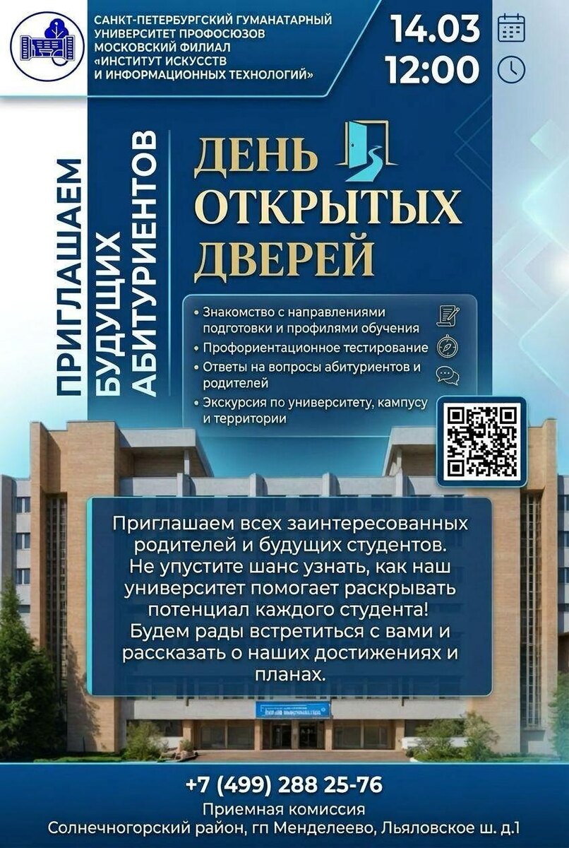 14 марта 12:00 Узнайте больше о поступлении, программах обучения и студенческой жизни Санкт-Петербургского Гуманитарного университета профсоюзов "Институт искусств и информационных технологий" ✅ Вас ждёт насыщенная программа: - Знакомство с направлениями подготовки и профилями обучения - Консультации приёмной комиссии и заведующих кафедрами - Экскурсия по университету, кампусу и территории - Для гостей будут работать кафе-столовая и буфет ➕ Зарегистрироваться: msk-gup.ru/day5 #Зеленоград #СПбГУП #ИИиИТ #Институт #Образование #Химки #Клин #Солнечногорск #Куркино #Менделеево #Лунёво #Фирсановка