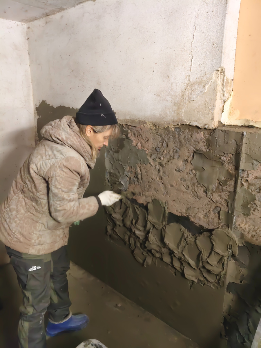 Я на замесе, Оля на " стене". У нее как то больше получается выправлять наши кривые стены. Порядка 10 мешков и часть подвала приобрела довольно эстетичный вид. Конечно не идеально, но как уж смогли. Вся проблема в том, что найти штукатура на 20 квадратных метров , и где половина этих метров закоулки- уголки- откосы и прочие неудобные места, практически невозможно. Всем подавай объем , с полным выравниванием под " маяки" . Вот и пришлось осваивать самим. Но мы уже много чего освоили, не привыкать.