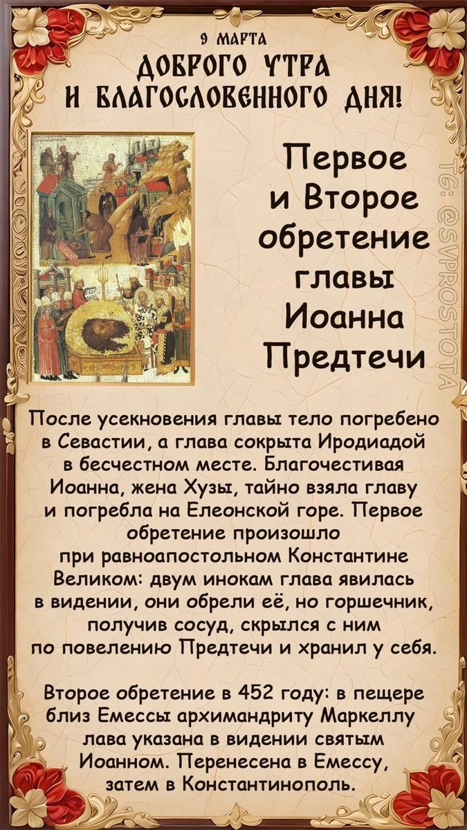🔸🔸🔸🔸☦🔸🔸🔸🔸 ⛪️9 МАРТА ЦЕРКОВЬ ПРАЗДНУЕТ Первое (IV) и второе (452) обре́тение главы Пророка, Предтечи и Крестителя Господня Иоа́нна 🔸🔸🔸🔸☦🔸🔸🔸🔸 🕊Ученики Иоанна погребли его тело, а глава была брошена Иродиадой. Жена Хузы, Иоанна, забрала главу тайно и спрятала в сосуд, погребла ее в одном поместий Ирода, на горе Елеонской. Позже владельцем земли стал Иннокентий, который возвёл там церковь. При раскопках строители нашли главу Иоанна Стали происходить знамения. Перед смертью Иннокентий вернул главу на прежнее место. Возведённая церковь пришла в упадок. В III‒IV веках паломникам, в Иерусалиме, было видение: Предтеча указал им, где его глава. Они нашли святыню и понесли ношу. Но отнеслись неблагоговейно и, встретив по дороге гончара, дали ему нести главу. Тогда святой Иоанн явился пред ним и приказал сбежать с тем, что было. Горшечник отнес святыню домой. После его смерти христиане, хранили её у себя дома. Очередь дошла до клирика Евстафия, который был в арианской ереси