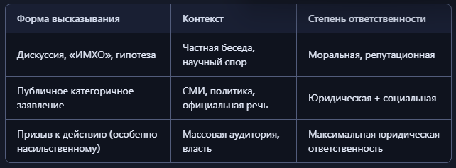 Если человек говорит «ИМХО», «предположим», «по моему мнению» — это дискуссия, пространство для идей, где ответственность мягче. Но когда речь идёт о публичном заявлении в категоричной форме («так есть и никак иначе»), особенно если оно влияет на массы или оправдывает действия, тогда и уровень ответственности должен быть выше.