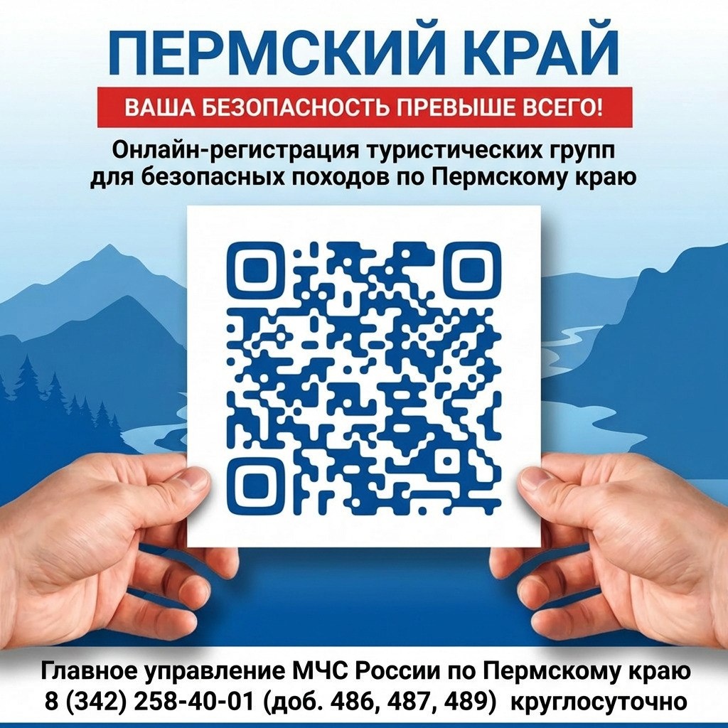 ! ⛺️ Планируя путешествие по Пермскому краю, не забудьте о безопасности. Обязательная регистрация туристической группы защитит вас и поможет спецслужбам знать ваше местоположение. Это особенно важно для тех, кто планирует путешествие по труднодоступным районам и маршрутам с повышенным риском. Процесс регистрации прост. Уведомления о мероприятиях подавайте заранее: ❗Заполните форму на сайте ГУ МЧС России по Пермскому краю: https://forms.mchs.gov.ru/registration_tourist_groups (или перейдите по qr-коду) ❗Если не получается зарегистрироваться заранее, сообщите о маршруте в ближайший пункт МЧС перед поездкой. ❗За сутки до и после мероприятия информируйте ОДС ГУ по телефону 8(342) 258-40-01 (доб. 486, 487, 489). Телефон работает круглосуточно. Берегите себя и наслаждайтесь путешествием! #ПрикамьеПоиск #ТуризмПермь