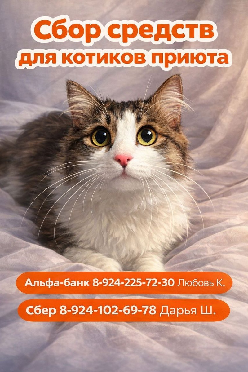 , у наших кошек закончился наполнитель для туалетов… Казалось бы такая мелочь, но на нашу ораву нужно крупная сумма денег 😒 Мы обращаемся к вам с важной просьбой. Для поддержания чистоты и гигиены в нашем приюте, а также для комфорта наших кошек и котят, нам крайне необходим наполнитель для их туалетов. Это одна из базовых потребностей, которая напрямую влияет на самочувствие животных. Ваша поддержка позволит нам: * Обеспечить чистоту в местах обитания кошек. * Создать комфортные условия для каждого животного. Заботиться об их здоровье и благополучии. Помогите нам сделать жизнь наших подопечных лучше! Реквизиты для помощи: альфа-банк 8-924-225-72-30 Любовь К. сбер 8-924-102-69-78 Дарья Ш. пометка благотворительность кошки Каждый рубль имеет значение! Благодарим вас за вашу щедрость и любовь к животным!