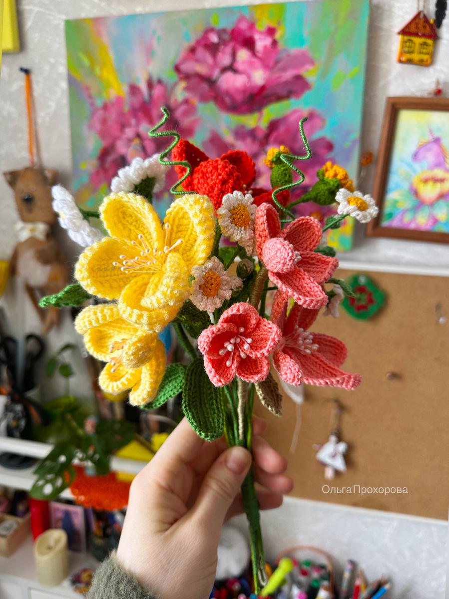 Этот букет мои первые эксперименты в вязании цветов, подарила маме на 8 марта.