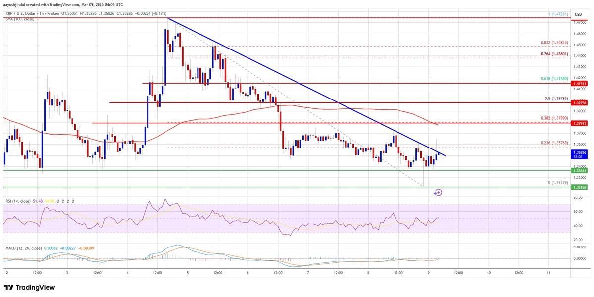 ? XRP продолжает снижаться, торгуясь ниже $1.3650 и 100-часовой простой скользящей средней. Цена консолидирует потери, но сталкивается с препятствиями в районе $1.3550 и $1.380. Если цена останется ниже $1.380, XRP может продолжить снижение. 📊 Ключевые моменты: - Текущая цена XRP: ниже $1.3620 - Ключевая медвежья линия тренда формируется с сопротивлением на $1.3520 - Сопротивления: $1.3520, $1.380, $1.3980 (50% Фибо) - Поддержки: $1.3365, $1.3220 - MACD для XRP/USD теряет темп в медвежьей зоне. - RSI для XRP/USD выше 50 уровня. ⚠️ Риски: Дальнейшее снижение, если XRP не сможет преодолеть зону сопротивления $1.380. Прорыв ниже $1.3220 может привести к снижению до $1.3120 и $1.30. Горизонт: краткосрочно