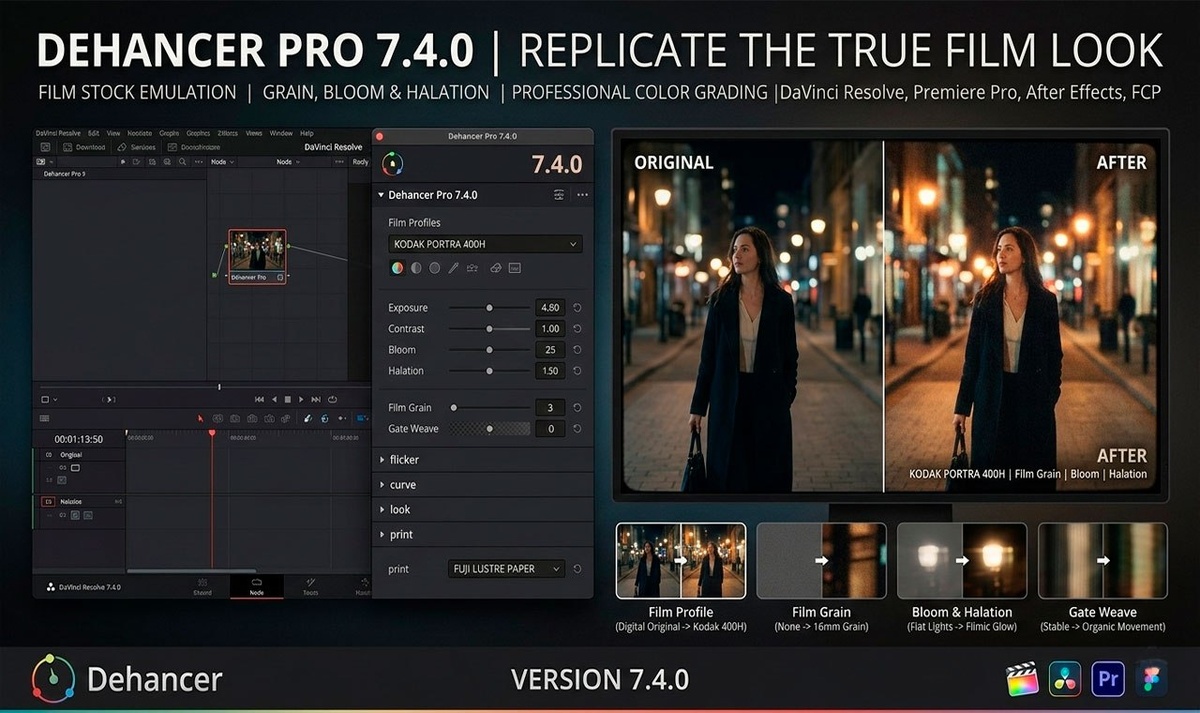 Dehancer Pro (7.4.0) плагин для цветокоррекции с эмуляцией плёночных процессов. Поддерживает DaVinci Resolve, Final Cut Pro. Включает улучшенные профили плёнки, инструменты зерна и грейдинга для создания кинематографичного образа. ОС: macOS 10.15 и выше Язык: Многоязычный Вип: Разблокированы ⬇️ Проверить на вирусы ✍️ Функции и возможности 🌐 Официальный сайт Автор: @RHelpit | ⭐️ 710 #macOS #ПроигрывателиM #693
