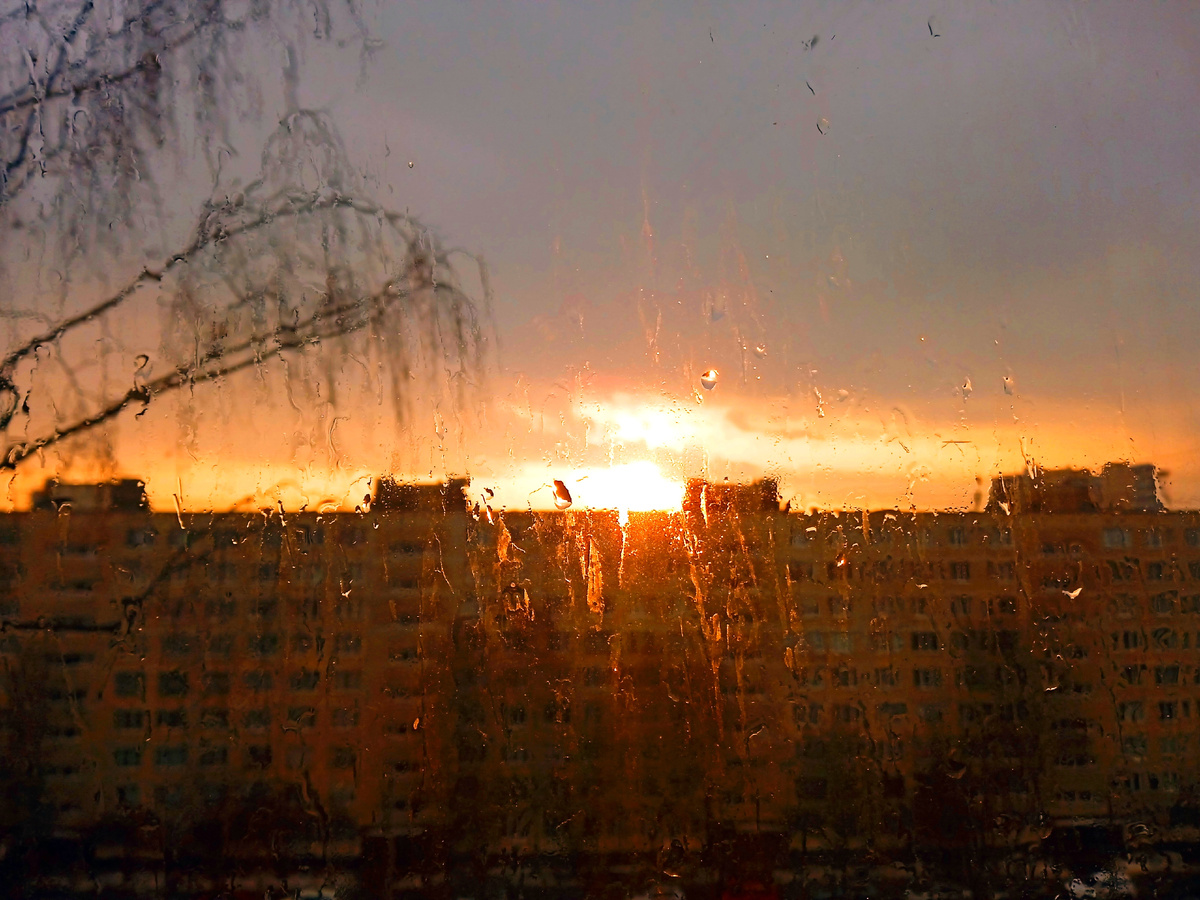 К вечеру пошел дождь, и пока совсем не стемнело, я наблюдала красивый закат. Сквозь стекло в капельках дождя ярко заходит солнце.