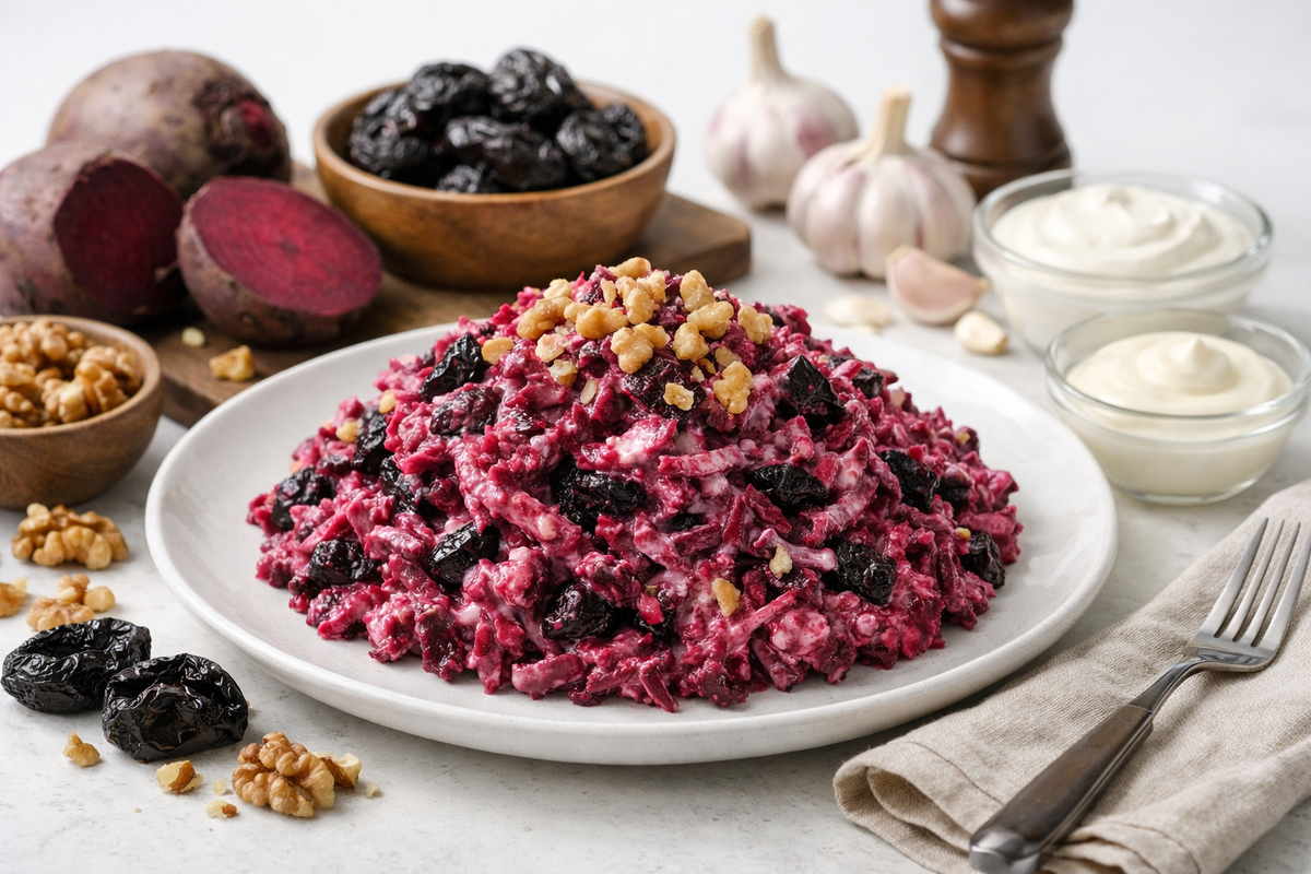 Есть салаты, которые вроде бы простые, но на столе ведут себя как главные герои. Свекла даёт сладость и цвет, чернослив добавляет глубину, орехи хрустят, а чесночная заправка на сметане и майонезе собирает всё в один точный, домашний вкус. Делается быстро, а выглядит так, будто вы старались дольше.