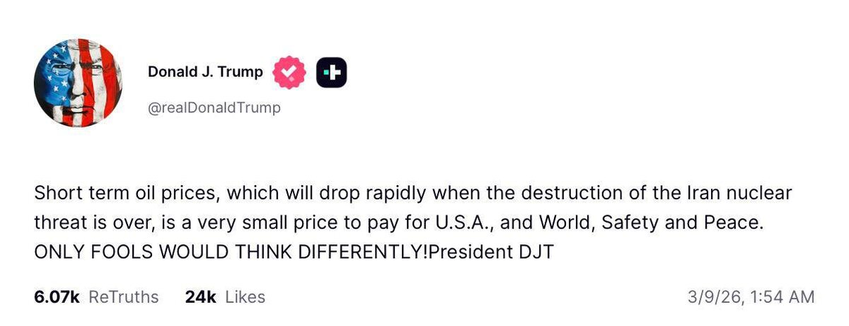 “Neft narxlarining qisqa muddatli oshishi — Eronning yadroviy tahdidi bartaraf etilgach tezda pasayib ketadigan holat. Bu AQSH va butun dunyo xavfsizligi hamda tinchligi uchun to‘lanadigan juda kichik narxdir. Boshqacha o‘ylaydiganlar faqat ahmoqlardir!” deya yozdi u o‘zining Truth Social ijtimoiy tarmog‘ida. @daryolive