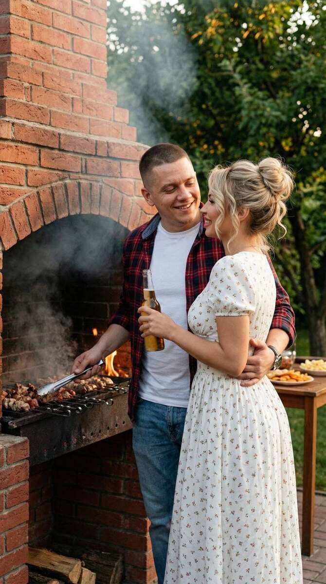 Промт пара жарит шашлыки Модель: Nano Banana Сгенерировать🪄 Кинематографический близкий портрет мужчины и женщины с мелким зерном Формат фото 9:16 Мужчина стоит у мангала и переворачивает шампуры, а девушка стоит рядом, обняв его одной рукой за талию, и протягивает ему бутылку пива. Они улыбаются друг другу. Одежда девушки: короткое белое платье в мелкий цветочек с пышной юбкой вверх по фигуре подчеркивает декольте короткие рукава , волосы собраны в небрежный пучок и несколько прядей обрамляют лицо Одежда мужчины: джинсы, белая футболка, клетчатая рубашка с закатанными рукавами Фон: мангал из красного кирпича, дымок, стол с закусками, зеленые деревья. Освещение: вечернее солнце, теплые тона, огонь подсвечивает лица. tDqUSUsv7PSGW1VWz2HVXf
