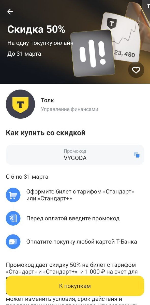 На "Толк 2026" Но, то ли забыли, то ли забили. Нашел сам) Короче, промокод на первые 2 тарифа - на скрине. Промокод на Про и Вип тарифы: DOP20 Такие дела. Я уже точно иду, коллеги-подписчики помогли собрать большую часть на билет🙏🥰 Это большое инвестиционное мероприятие от Т-банка Долго расписывать не буду, но если Вам интересны инвестиции, кажется, что попробовать стоит каждому, либо в онлайн, либо в офлайн формате (что ещё лучше). Мне удалось найти 2 варианта промокодов. Кстати, похоже что промокод на первые два тарифа прям выгодный, с учётом того, что там дают 1000р на инвестиции.