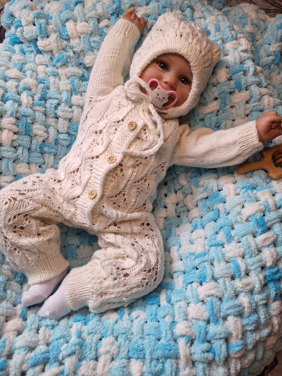 Посмотрите, какая нежность! 🧶 Комбинезон выполнен с невероятной любовью: ажурный узор, аккуратные пуговицы, просто восторг! 🤩 А мягкий плед на фото дополняет уютную атмосферу вязаных изделий 😍