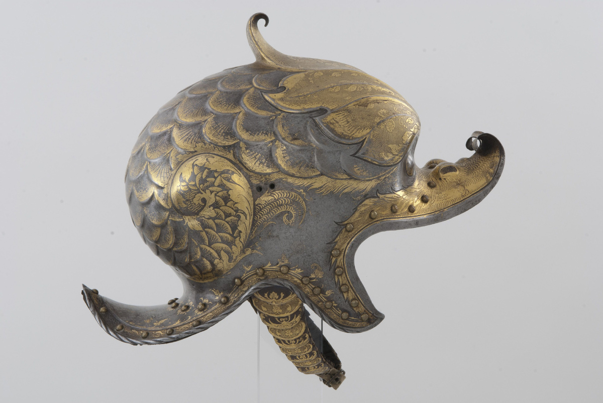 В мадридской Королевской оружейной хранится шлем императора Карла V, выполненный в форме дельфина. С человеческими глазами, с золотой чешуей, с хвостами дракона. Это не аллегория на картине, а реальный бургонет XVI века. Он создан в Аугсбурге около 1530 года и зафиксирован в императорских описях. Перед нами редкий случай, когда доспех говорит на языке политики почти громче, чем хроники. Этот шлем относится к типу бургонетов, распространенных в Европе XVI века. В испанских документах он назван borgoñota, но в русской оружиеведческой традиции используется термин «бургонет». Конкретный экземпляр хранится в Королевской оружейной Мадрида и принадлежал императору Carlos V. Шлем изготовлен в Аугсбурге около 1530 года. На левой стороне имеется клеймо мастера: шлем под шестиконечной звездой. Это знак Kolman Helmschmid, придворного оружейника императора. Его мастерская обслуживала дом Габсбургов и считалась одной из ведущих в германских землях. Форма бургонета необычна. Он выполнен в виде дельфи