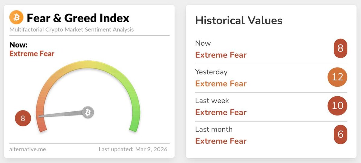 🔸Индекс страха и жадности в криптовалютах упал обратно к 8, оставаясь в зоне крайнего страха.