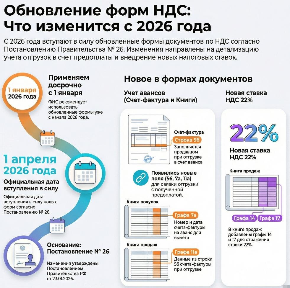 С 1 апреля 2026 года вступают в силу обновленные формы счета-фактуры, книги покупок и книги продаж! Примечание: Но уже с 1 января применяем рекомендованные формы - которые практически уже новые! 📝 ЧТО ИЗМЕНИЛОСЬ: Счет-фактура: • Новая строка 5б — заполняется продавцом при отгрузке товаров/работ/услуг в счет ранее полученной предоплаты Книга покупок: • Новая графа 7а — для вычетов НДС, ранее исчисленного с предоплаты. Указываются номер и дата счета-фактуры, выставленного при отгрузке в счет аванса Книга продаж: • Новая графа 11а — заполняется при отгрузке в счет предоплаты, отражаются данные из строки 5б счета-фактуры • В графах 14 и 17 — ставка НДС 22% • В графах 14а и 17а — ставки 20% или 18% ⚠️ Важно: До 1 апреля 2026 года ФНС рекомендует использовать формы из письма от 26.12.2025 № СД-4-3/11730@ 🎓 Для участников курсов: Подробный разбор всех изменений добавлю в курсы «Упрощёнка + НДС» и «Глобальные налоговые изменения». 📎 Реквизиты: Постановление Правительства РФ от 23.01.2026 №