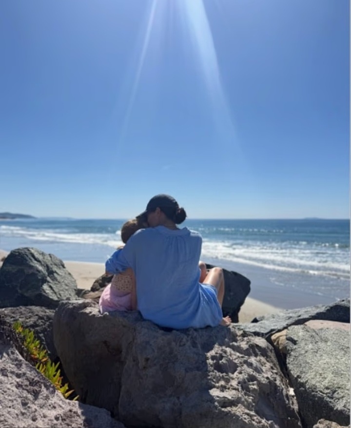 Сложно описывать это фото. Просто две спины на фоне красивого побережья. Меган сидит босиком на большом камне и обнимает дочь. На герцогине надета голубая рубашка (или это короткое платье?..) и чёрная бейсболка, а Лилибет в светлом топике и розовой юбке.