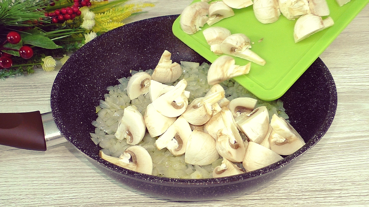 Когда лук стал прозрачным, отправляю в него подготовленные грибы. Мелко резать не советую.