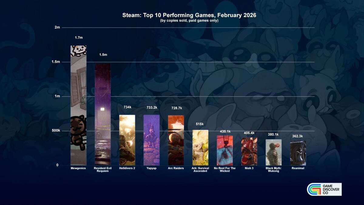 Каждый месяц проходит условная статистическая битва между старыми и новыми играми в Steam — какие из них будут лучше продаваться. В феврале сразу две новые игры прочно заняли первые два места рейтинга по количеству проданных копий, обогнав старые хиты более чем в два раза (по данным GDCo). Тёмная лошадка прошлого месяца — то есть игра, которая словно вынырнула из ниоткуда и сразу стала хитом. Более 1 700 000 проданных копий менее чем за три недели — это потрясающий результат. В итоге даже одна из самых ожидаемых игр этого года была обойдена на целых двести тысяч продаж. Тем не менее новая часть «Резидента Зла» показала хорошие результаты, и только феномен Mewgenics не позволил игре стать лучшей по продажам в феврале в Steam (хотя выручка всё равно намного выше за счёт более высокого ценника за штуку). В новой части получился удачный баланс между двумя играбельными персонажами, один из которых вызывает интерес новизной, а другой — своей легендарностью. Купить Resident Evil Requiem в St