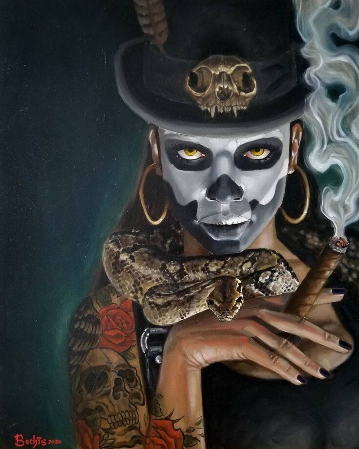 Маман Бриджит женская Сила семейства Геде, покровительница кладбищ и защитница. Считается что она связана с очищением и защитой от злых духов, но она самом деле область ее помощи куда шире.