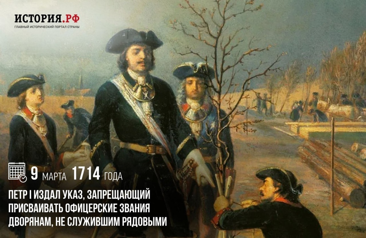 Петр I издал указ, запрещающий присваивать офицерские звания дворянам, не служившим рядовыми. До этого некоторые представители дворянского сословия, пользуясь своим происхождением, либо вовсе не служили в низшем солдатском чине, либо ограничивались коротким сроком в несколько месяцев, а потом проходили службу в офицерских чинах. Также государь усилил наказания для тех, кто уклонялся от службы: они лишались имущества и подвергались шельмованию. В конце 1720 года Петр издал очередной указ, предписывающий обер-офицерам, происходящим не из дворян, выдавать патенты на дворянское достоинство и считать дворянами их детей и все их потомство #ПамятныеДатыВоеннойИсторииОтечества #ДеньВИстории #ГодЗащитникаОтечества #80ЛетВеликойПобеды Источник: https://vk.ru/wall-216215303_3060 Подпишитесь на наши группы ВКонтакте, в Одноклассниках, в Телеграм - читайте, смотрите и комментируйте информационные материалы, предлагайте свои! Источник: Открыть