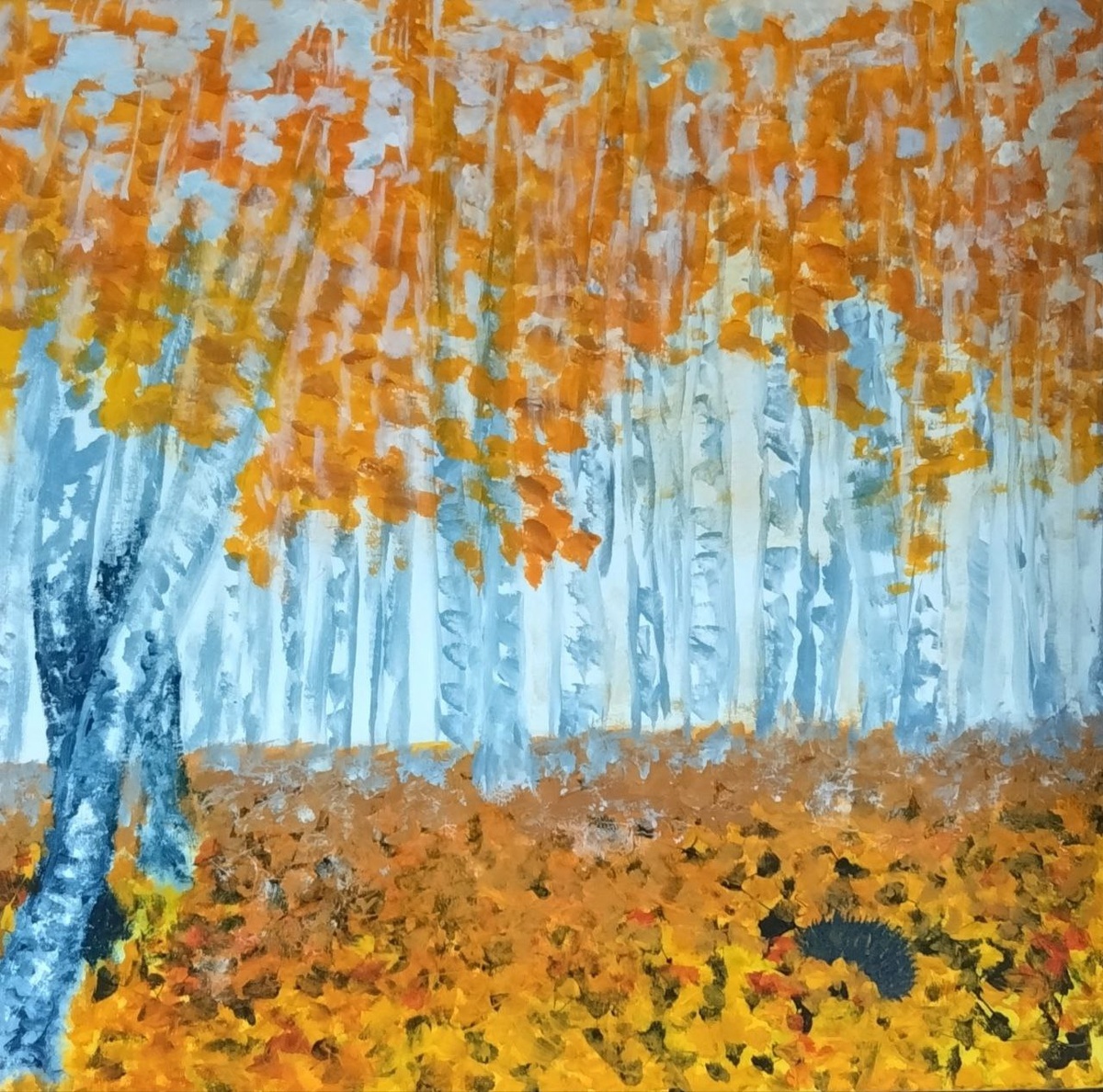 Иногда картина начинается не с кисти, а с дороги. В декабре прошлого года я оказалась в Тюмени. По календарю уже зима, но лес будто не согласился. Передо мной стояла почти прозрачная берёзовая роща: тихие белые стволы и наверху — облако золотых листьев. Настоящая осень, которая решила немного задержаться. Я не старалась копировать тот лес. Хотелось передать ощущение: тишину, свет между деревьями и листья, падающие как медленный золотой дождь. Получился осенний берёзовый лес, который немного спорит с календарём. Иногда природа шутит. Например, оставляет осень в декабре. А художник потом переводит эту шутку на язык красок. 🍂