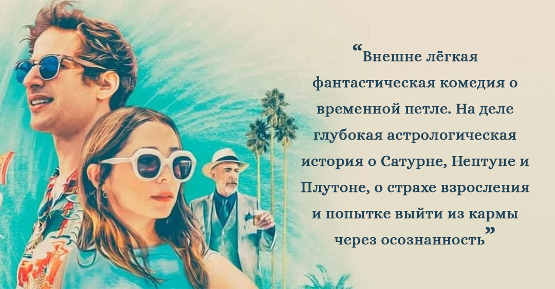 «Зависнуть в Палм-Спрингс» астрологически рассказывает о переходе от Нептуна к Урану, от инфантильного ухода в иллюзии к осознанности. Карму нельзя прожить весело, от Сатурна не убежишь. Когда человек берёт ответственность — время снова идёт. Любовь в этом фильме — не чувство, а взросление вдвоём. Это союз 8 дома: мы либо трансформируемся вместе, либо разрушаем друг друга.