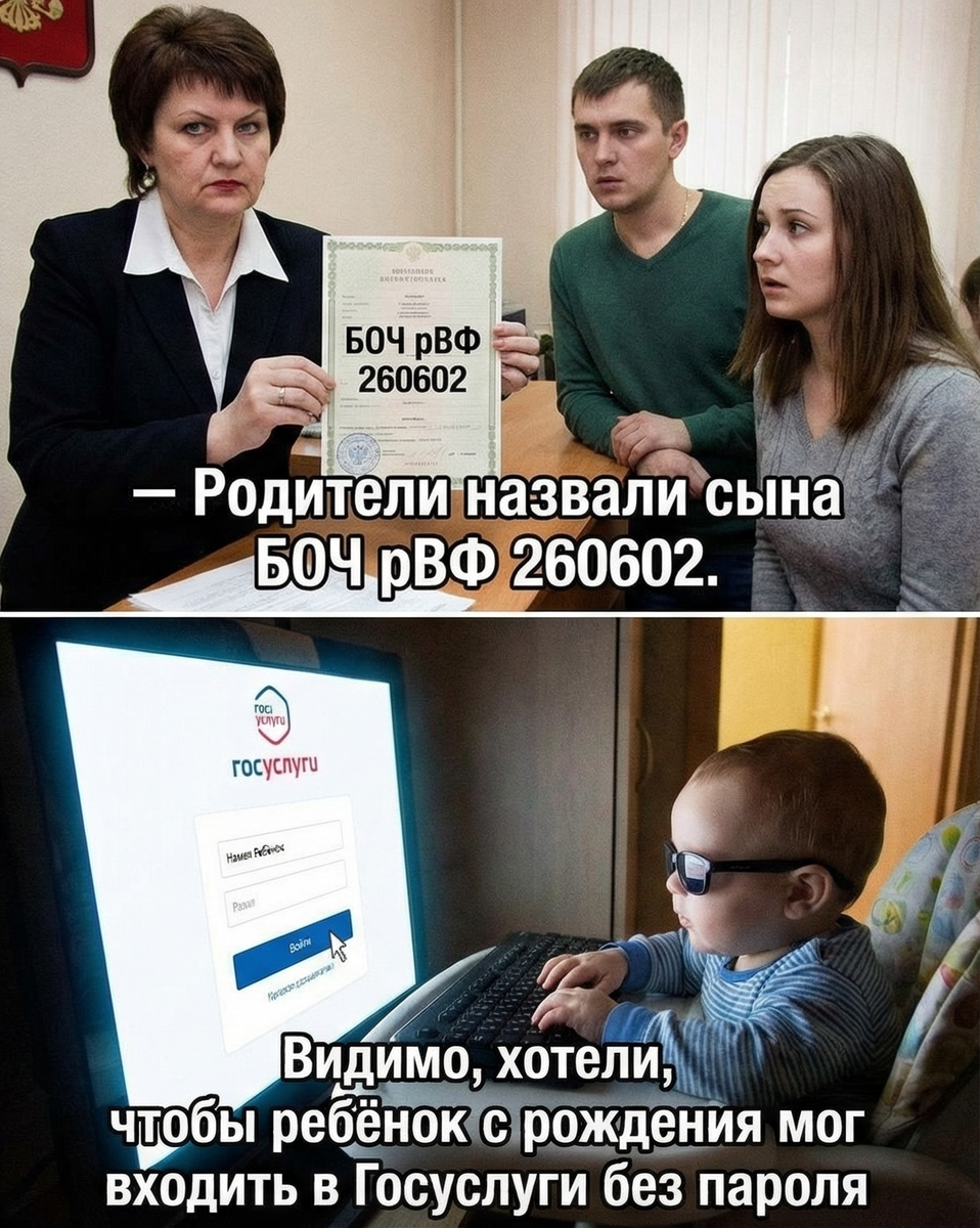 В 2002 году московская чета Ворониных-Фроловых пришла в ЗАГС с чистым листом: они хотели назвать новорождённого сына «БОЧ рВФ 260602». Расшифровка — «Биологический Объект Человек рода Ворониных-Фроловых, родившийся 26 июня 2002 года». Чиновники отказали. Ребёнок несколько лет жил без документов. Дома его звали Бочей.