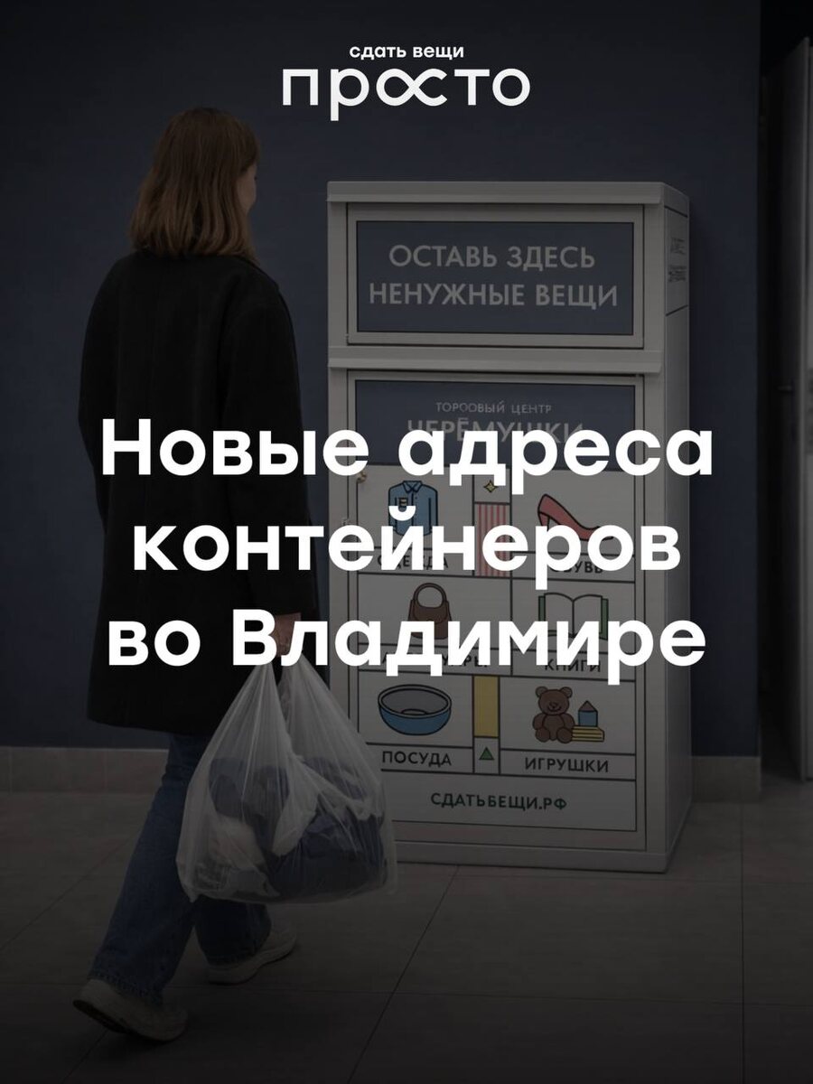 ♻️ ▫️ ТЦ «Черёмушки» — проспект Строителей, 9Б ▫️ ул. Чайковского, 3Г секонд-хенд «Добромаркет» Ежедневно с 9:00 до 20:00 ▫️ ул. 16 лет Октября, 65 склад «Сдать вещи Просто» Пн–Пт: с 9:00 до 17:00 ▫️ ул. Электрозаводская, 1 Центр гуманитарной помощи Вт–Пт: с 9:00 до 18:00 Сб: с 9:00 до 14:00 ▫️ ПВЗ Ozon — с. Богослово, ул. Нагорная, 2 ▫️ ПВЗ Ozon и Wildberries — д. Зелени, ул. Светлая, 2 ▫️ ПВЗ Ozon — ул. Нижняя Дуброва, 36, рынок «Слобода» ▫️ Россельхозбанк — ул. Большая Московская, 1Б ▫️ Рынок на Студёной — ул. Дворянская, 27А, корпус 1 (1 этаж) ❗ Важно: пожалуйста, сдавайте чистые и сухие вещи, пригодные для дальнейшего использования. 📍 Контейнеры продолжат появляться и по другим адресам — следите за обновлениями. 🌐 сдатьвещи.рф