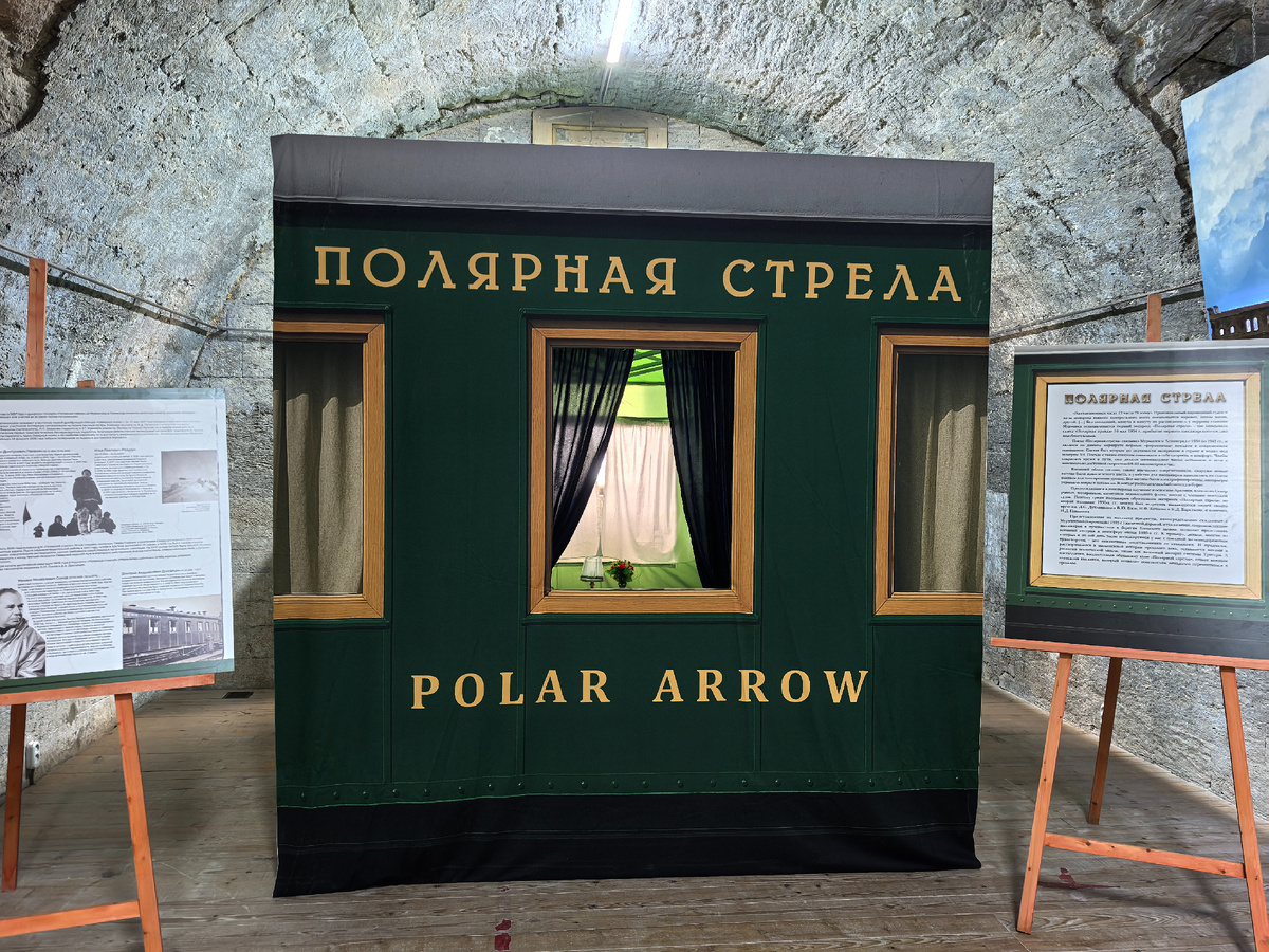Именно этим поездом полярники и учёные отправлялись покорять Арктику. Центральным элементом выставки стала инсталляция, воссоздающая интерьер купе «Полярной стрелы».