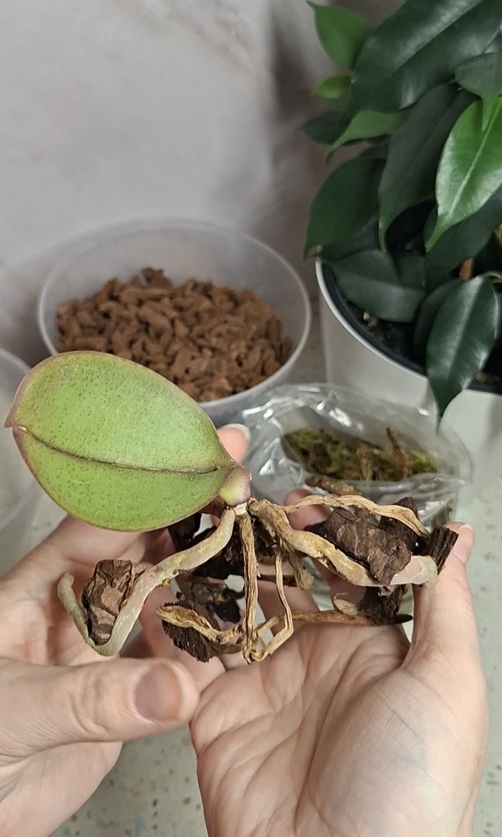 Растение находится в критическом состоянии: у орхидеи сохранился всего один лист и пара корешков. Первым делом проводим тщательный осмотр корневой системы. Нам предстоит аккуратно удалить все нежизнеспособные, подгнившие корешки. Работаем аккуратно, с максимальной осторожностью, чтобы не травмировать ещё живые корни. Для посадки я подготовила качественный субстрат: кору и сфагнум. Важный момент: уже на следующий день после посадки растению потребуется первый полив. Восстановление процесс не быстрый. Продолжение следует... Видео про спасение орхидеи