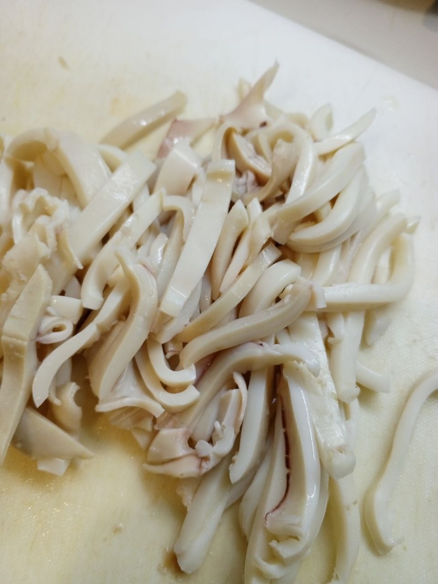 К сожалению, фото готового блюда не сохранено по техническим причинам. Поверьте на слово, это и красиво и очень вкусно! Кальмар опустить в кипяток чтобы побелел. Грибы и лук обжарить. Кальмар нарезать и выложить к грибам, соль, перец. Долго не жарить, поперемешивать чтобы кальмар прогрелся. Добавить сметану, ещё немного погреть. Можно подать с рисом или картофелем. Или как пасту. Сытно и нежно. Готовьте с удовольствием! #готовимдомавкусно #кальмар #грибы #шампиньоны #лук #сметана #обед #ужин #паста