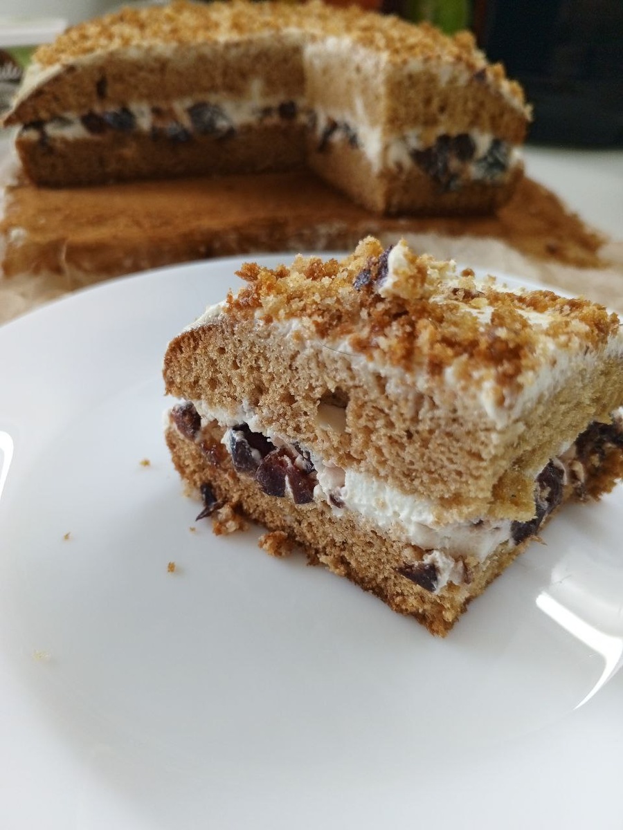 4 яйца и 150 г сахара взбить в крепкую пену, около 6 минут. 4 ст. л. мёда и 80 г сливочного масла растопить, добавить чайную ложку корицы, добавить чайную ложку соды. Должна подняться пышная пена. Аккуратно соединить две смеси, постепенно ввести 200 г муки, перемешивая ложкой снизу вверх. Форму застелить бумагой для выпечки, выпекать при t180* минут 25. Полностью остудить. Крем - 300 г сметаны 20%, сахар 100 г. Смешать. Сливки 33% взбивать 1 мин. Соединить, взбить до стабильности пару минут. Такой крем стабилен, на вкус нежный и подходит для украшения. Готовьте с удовольствием! #готовимдомавкусно #торт #медовик #выпечка #чернослив #крем #сметана #сливки