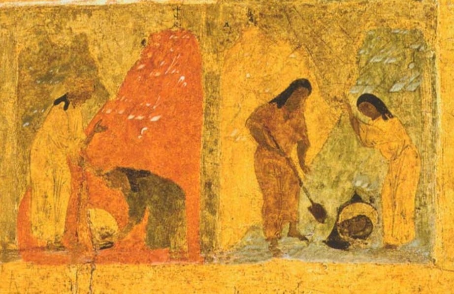 Клейма икон XVI в. Церковь празднует три обретения главы Иоанна Предтечи. Согласно преданию, Иродиада не позволила похоронить голову Крестителя вместе с телом, боясь, что он воскреснет. Главу тайно захоронили на Елеонской горе, где ее обнаружил вельможа Иннокентий. После его смерти о реликвии забыли, а во время правления Константина Великого ее вновь обнаружили два монаха-паломника. Как правило, изображения обретений присутствуют в клеймах икон Иоанна Предтечи (1-4, 6-9), крайне редко можно встретить отдельную композицию праздника, например, на иконе XVI века из собрания музея им. Андрея Рублева (5).