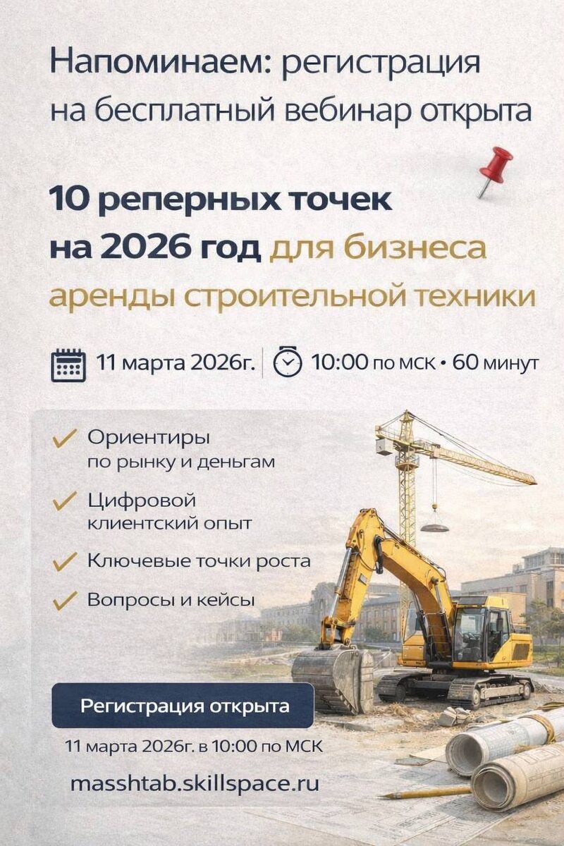 Напоминаем: регистрация на бесплатный вебинар открыта 📌 Если вы ещё не зарегистрировались на вебинар «10 реперных точек на 2026 год для бизнеса аренды строительной техники и оборудования» — сейчас самое время. На встрече разберём, какие изменения уже влияют на рынок аренды техники и что важно держать в фокусе, чтобы не терять деньги на неверных решениях. За 60 минут — ключевые ориентиры по рынку, деньгам, клиентскому опыту, кадрам и новым требованиям. После — 30 минут вопросов и разбор отдельных кейсов. Запись и материалы получат все зарегистрированные. ✅ Регистрация: https://masshtab.skillspace.ru/stream/69a587382e70dee7156d72bb Записывайтесь на курс, узнаете детализацию UNIT экономики бизнеса аренды строительной техники и оборудования и процессы настройки эффективного отдела продаж: - ДООП «Маркетинг в бизнесе аренды строительной техники» masshtab.skillspace.ru/...1e7 - ДООП «Продажи в бизнесе аренды строительной техники» masshtab.skillspace.ru/...0a5 - ДООП «Менеджмент в бизне