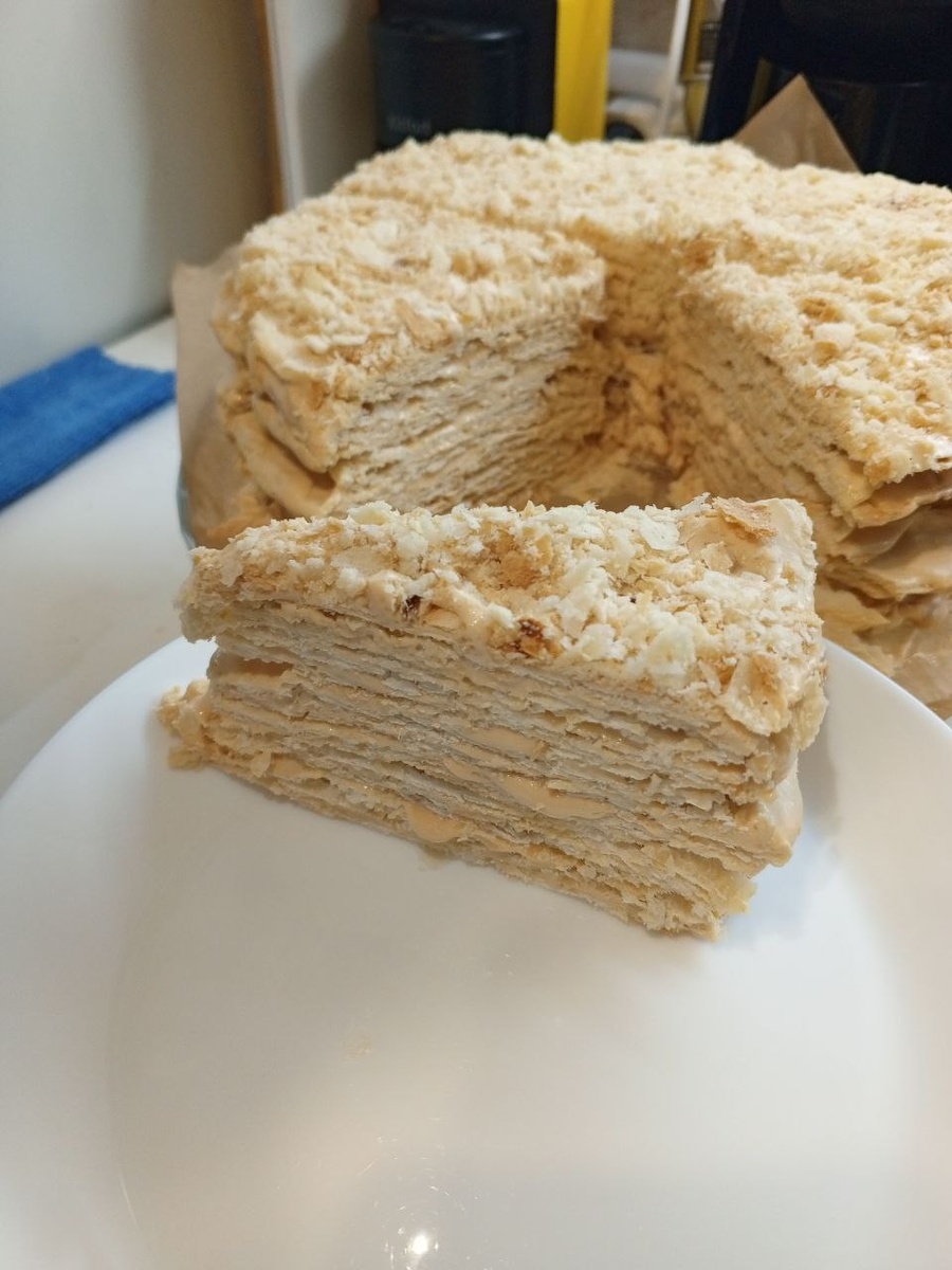 300 г сливочного масла, 1 банка варёной сгущёнки, 1 банка простой. Получается чуть карамельный вкус. Это просто божественно! Можно есть не останавливаясь)). Для теста 250 г очень холодного масла растереть с 450 г муки. Я масло терла на тёрке. Яйцо смешать с 150 мл воды и 1 ст. л. уксуса 9%. Щепоть соли и ввести яйцо в мучную крошку. Долго месить не надо, только собрать тесто в комок. Разделить на 12 кусочков примерно по 75 г. Выпекать t 180* около 7 минут. Тесто при выпекании сжимается, делайте поправку на размер формы. Готовьте с удовольствием! #готовимдомавкусно #выпечка #десерт #торт #слоеное_тесто #масло_сливочное #сгущёнка_варёная