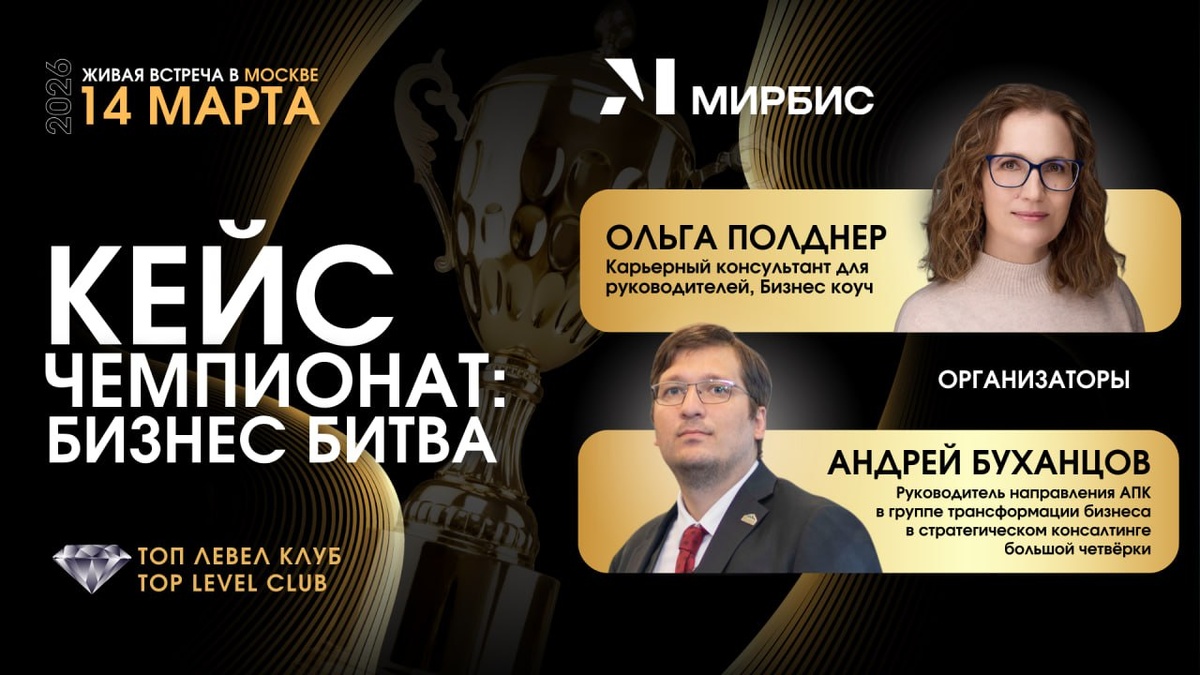 🌟 ТОП ЛЕВЕЛ КЛУБ / TOP LEVEL CLUB и МИРБИС приглашают на «КЕЙС ЧЕМПИОНАТ: БИЗНЕС БИТВА» Мероприятие только для руководителей и топ - менеджеров после подтвержденной организаторами регистрации 👆Дата: 14 марта 2026, суббота 👆Время: 10:00 - 19:00, весь день 👆Адрес: Москва, МИРБИС, детали - в ТГ чате мероприятия 👆Дресс-код: Деловой стиль 📢 ОРГАНИЗАТОРЫ: ТОП ЛЕВЕЛ КЛУБ / TOP LEVEL CLUB и МИРБИС, Московская международная высшая школа бизнеса 🟠 ОЛЬГА ПОЛДНЕР, Карьерный консультант для руководителей, Бизнес коуч, ТГ @olgapoldner, основатель ТОП ЛЕВЕЛ КЛУБ / TOP LEVEL CLUB 🟠 АНДРЕЙ БУХАНЦОВ, Руководитель направления АПК в группе трансформации бизнеса в стратегическом консалтинге большой четвёрки ПРИГЛАШАЕМ ВАС: - решить реальную бизнес-задачу в новой топ команде за ограниченное время - сравнить свое решение с тем, что выбрал бизнес - заказчик - расширить свой круг знакомств среди руководителей - получить разминку для ума и удовольствие не только от участия, но и победы име