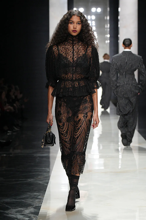 Итальянский дуэт Доменико Дольче и Стефано Габбана в очередной раз доказал: истинная красота не требует кричащих красок. 🌓 Новая коллекция сезона осень-зима 2026, получившая неофициальное название «Ода черному», стала триумфальным возвращением к корням бренда. Это манифест безупречного стиля, где каждый стежок пропитан ДНК сицилийской эстетики. Коллекция получилась предсказуемо прекрасной, но при этом свежей и остроактуальной. Главным героем подиума стал черный цвет во всем его многообразии - от глубокого матового до мерцающего атласа. Дизайнеры сделали ставку на приталенные силуэты, которые воспевают женственность в ее самом сильном проявлении. Особое внимание привлекают акцентные плечи. Этот элемент придает образам строгость и драматизм, создавая идеальный баланс между хрупкостью и властностью. На фоне жестких линий плеч еще более эффектно смотрятся костюмы в мужском стиле в тонкую полоску, которые в этом сезоне рекомендуется носить с безупречно белыми, накрахмаленными блузами. D