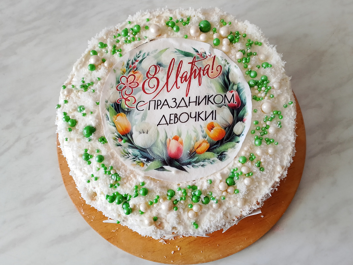 Утром сняла кольцо. Обмазала отложенным кремом бока и обсыпала их кокосовой стружкой. Для украшения я заказала посыпку бело-зеленого цвета. Это шарики разных размеров. И картинку на рисовой бумаге. К ней продавец положил бабочек.