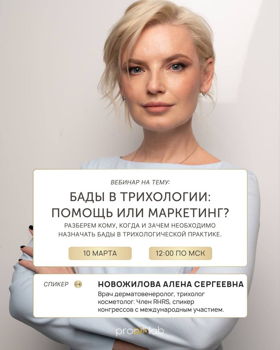 Алена Сергеевна Новожилова - врач-дерматовенеролог, трихолог, косметолог. Член RHRS и спикер международных конгрессов. Обсудим: «БАДы в трихологии: реальная помощь или грамотный маркетинг?» Биодобавки сегодня — одна из самых обсуждаемых тем в уходе за волосами. Но как отличить работающий протокол от рекламной уловки и не назначить лишнего? ⏰ 10 марта в 12:00 (МСК) разберем по полочкам: — Кому, когда и зачем: определяем четкие показания для назначения нутрицевтиков в практике трихолога. — Помощь или маркетинг: как выбирать препараты, которые действительно приносят результат. — Экспертный взгляд: Алена Сергеевна поделится опытом применения БАДов в комплексной терапии. 👉 Чтобы подключиться к вебинару, переходите в наш чат-бот и пишите слово «вебинар». Участие бесплатное. #трихология #бады #здоровьеволос #probiolab