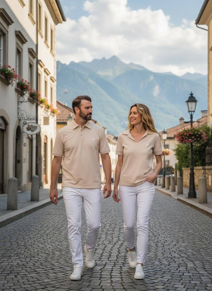 Хлопковые поло в бежевом оттенке и парном образе - всегда отличная идея