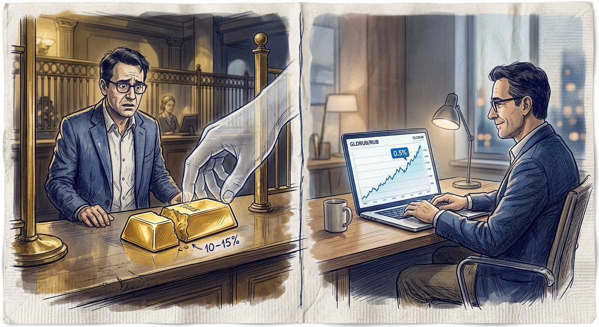 Проблема в том, что между мировой биржевой ценой и ценой, по которой вам продаёт золото банк, стоит спред (разница между покупкой и продажей). В спокойное время он составляет 3–5%, но в стрессовые периоды взлетает до 10–15% и выше. То есть вы начинаете вложение с жесткого минуса: золото сначала должно вырасти на размер этого спреда, чтобы вы просто вышли в ноль.