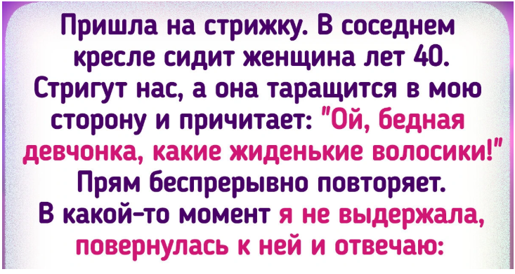 - Пришла на стрижку. В соседнем кресле сидит женщина лет 40. Стригут нас, а она таращится в мою сторону и причитает: «Ой, бедная девчонка, какие жиденькие волосики!» Прям беспрерывно повторяет. В какой-то момент я не выдержала, повернулась к ней и отвечаю: «Ну родилась я такая, не с конской гривой, и что? Побриться и уйти в монастырь? Я с тремя волосинками, вашими же словами, сижу, а вы с четырьмя волосинками, но выделываетесь. Вам бы воспитания и чувства такта набраться. Ой, бедная женщина, такая старая и невоспитанная». Весь салон молчал, тишина гробовая стояла, а эта дама не проронила ни слова. Но когда уходила, слышала, как она шепотом пыталась оправдаться: «А что я такого сказала? Нервная нынче молодежь пошла». © virtualtourist