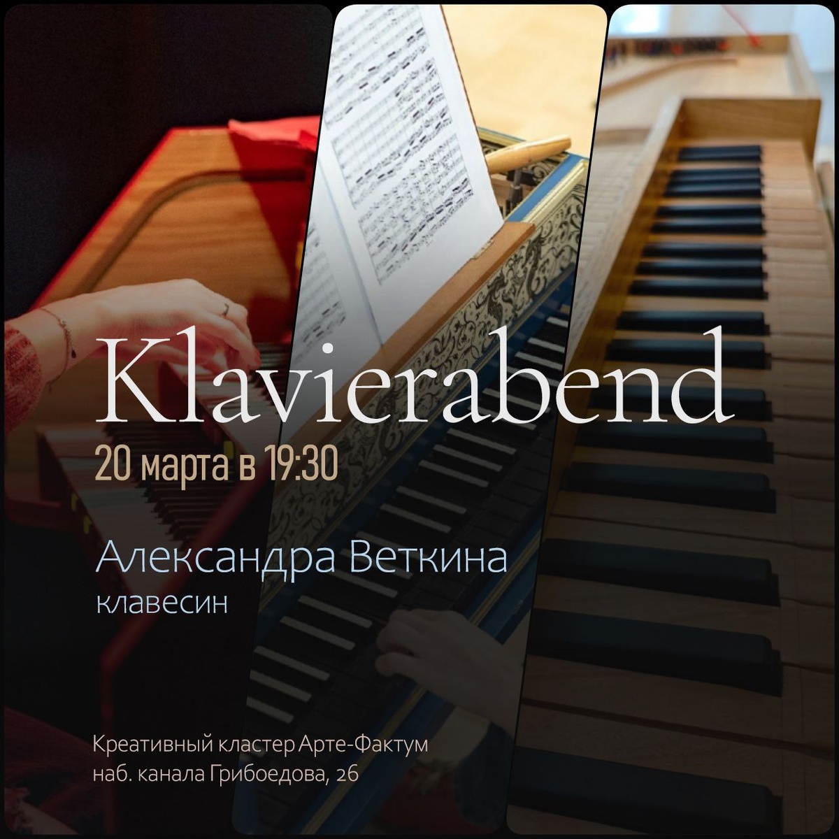 20 марта в 19:30 Креативный кластер Арте-Фактум (Набережная канала Грибоедова, 26) Возвращая и улучшая старые филармонические традиции Петербурга, мы запустили цикл концертов с названием Klavierabend – вечер клавирной музыки. Именно так назывались вечера фортепианной музыки в Ленинграде до Великой Отечественной войны. Но клавир – это широкое понятие. Применительно к старинной музыке оно включает в себя и клавесин, и клавикорд, и даже орган. 20 марта в 19:30 вас ждет вечер, посвященный клавесину и шикароной французской музыке, написанной для этого инструмента. Играть для вас будет Александра Веткина.