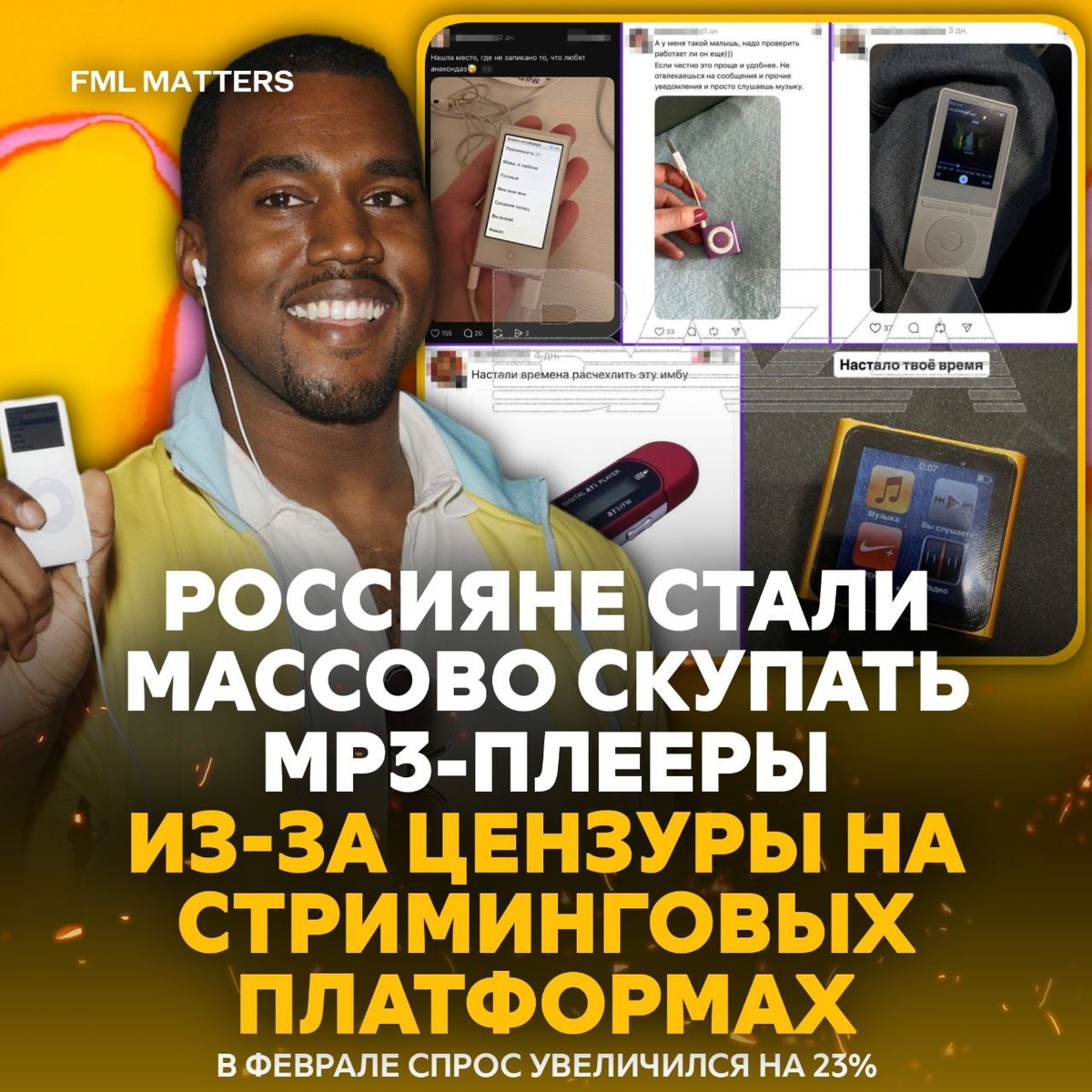 ! В феврале 2026 года спрос на портативные аудиоплееры в России вырос на 23% — после того как стриминги начали вырезать слова из треков и удалять альбомы из-за закона о запрете пропаганды наркотиков. Средняя стоимость ретро-вариантов на вторичном рынке составила 6300 рублей. Дожили 💔 💀 FML MATTERS