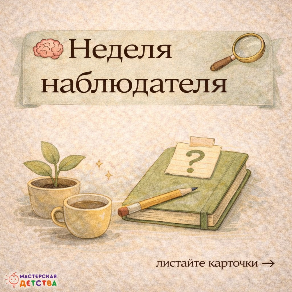 Не спешить исправлять, объяснять или вмешиваться, а попробовать понять, что на самом деле происходит с ребёнком и с нами. На эту неделю предлагаем небольшой эксперимент — неделю наблюдателя. Собрали несколько простых пунктов, которые помогут по-новому посмотреть на привычные ситуации. Листайте карточки ⬆️ #МастерскаяДетства